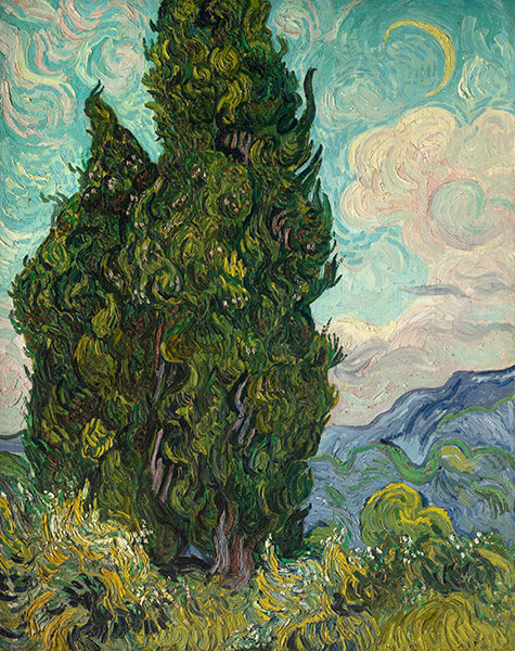 “Cypresses” was painted in late June of 1889, when he began his year-long stay at the asylum in Saint-Rémy. He wanted to capture the big, tall trees that to him appeared as dark spots under the powerful sunlight.